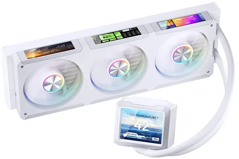 320Вт, 3x120мм, 700-2400 об/мин, 30дБ, ARGB, ЖК дисплей, 115x/1200, 1356, 1366, 1700, 1851, 2011, 2011-3, AM4, AM5, 4-pin PWM, 9-pin USB, цвет белый